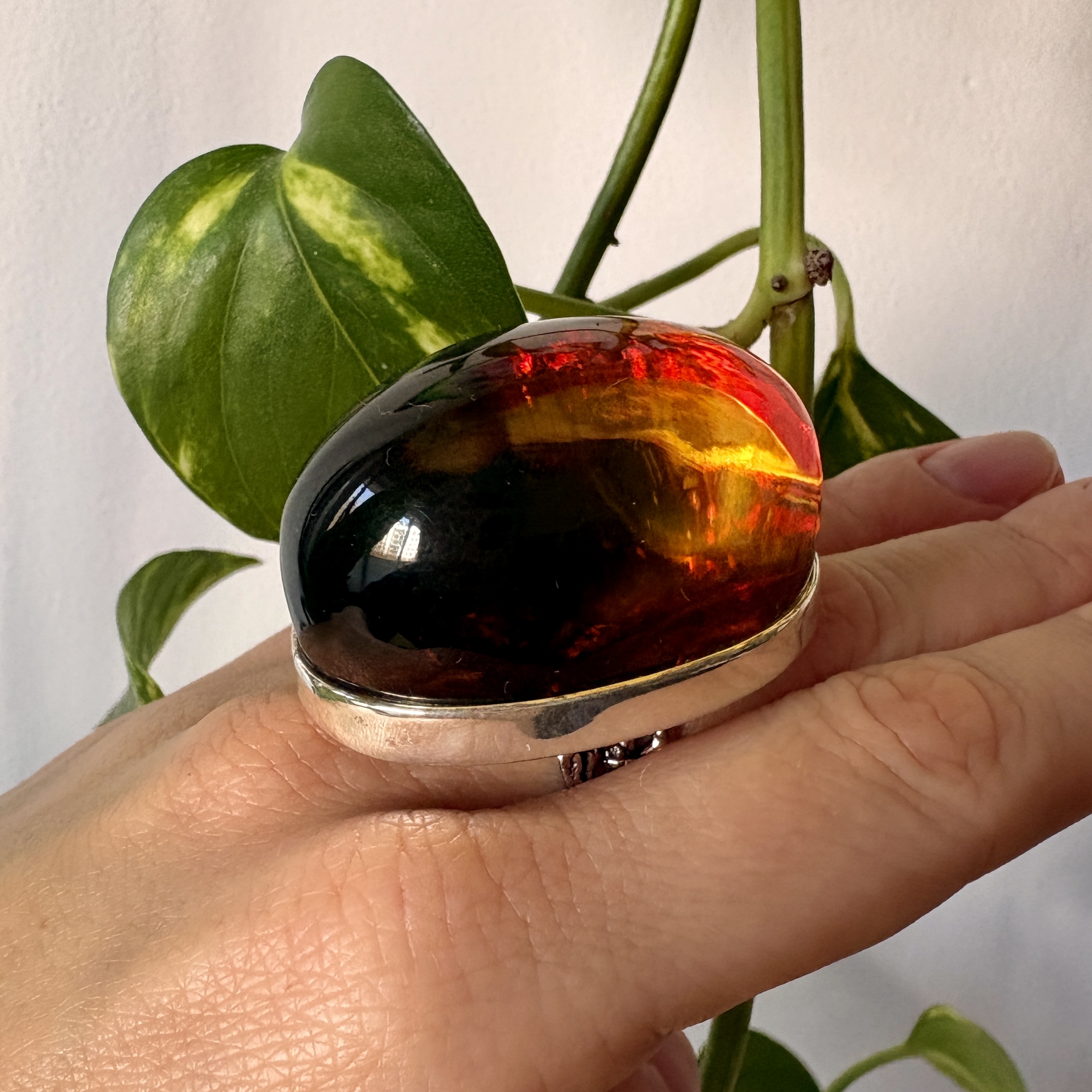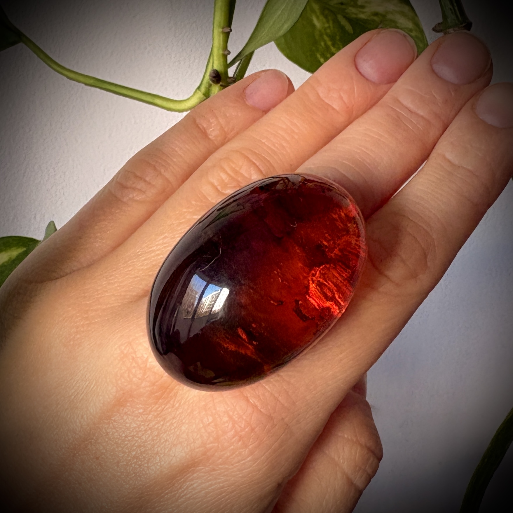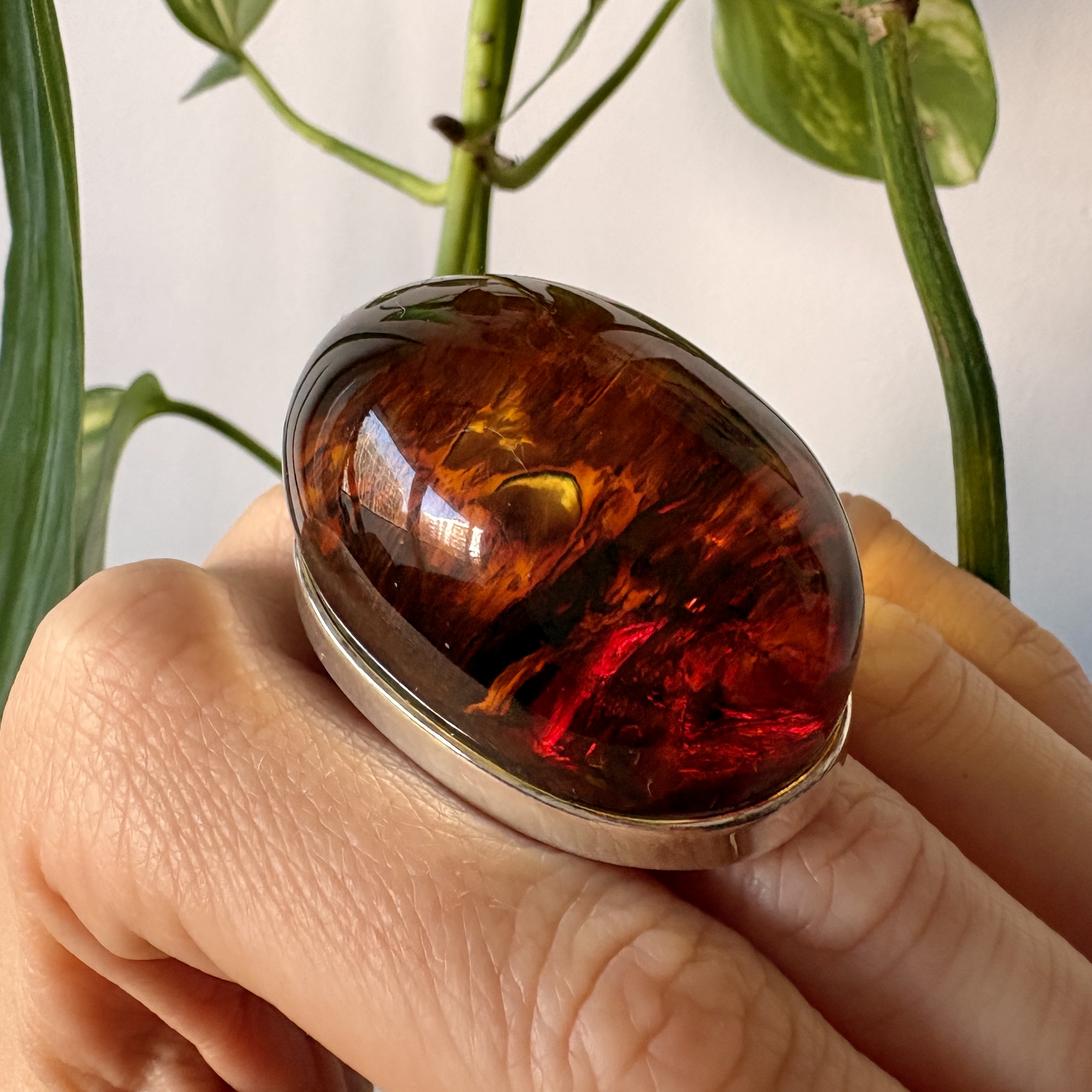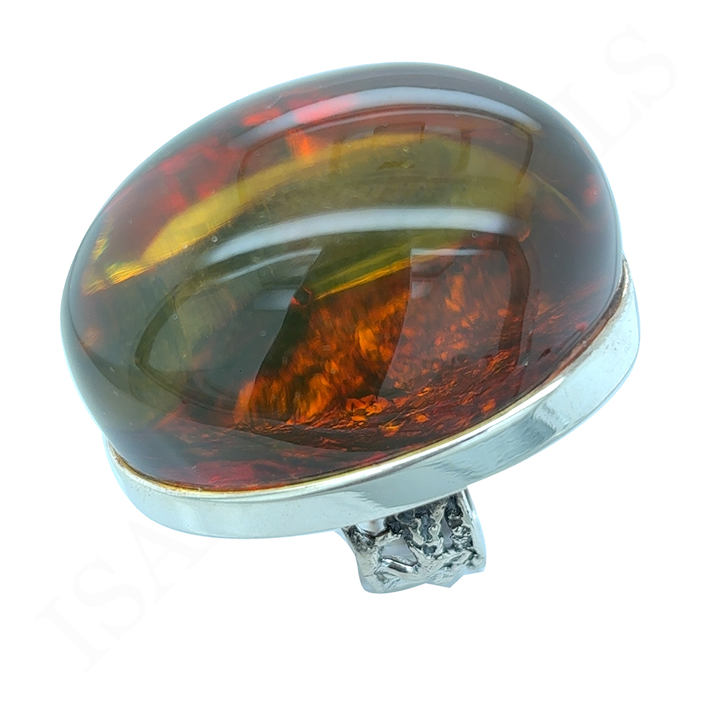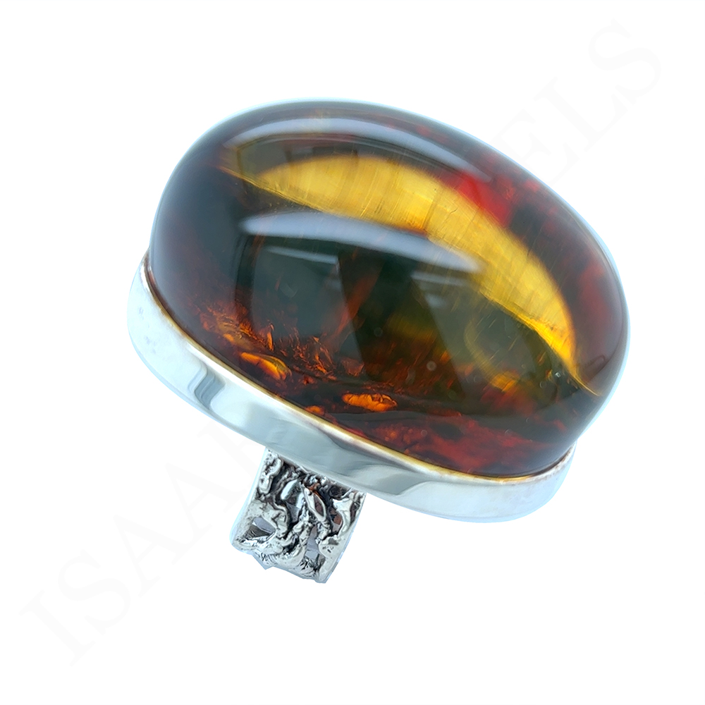 Bursztynowe oczko jest o tyle unikatowe, że gdy przyjrzysz mu się z bliska widać niesamowitą strukturę dna kamienia. Jego barwa również ukazuje to, jak wyjątkowy może być Bursztyn Bałtycki. Dzięki jego przeźroczystości ciekawa jest obserwacja kamienia z różnych stron w momencie, kiedy światło pada na niego z innego kąta. To na prawdę arcydzieło Natury. Bursztyn w tym pierścionku jest bardzo wysoki - jest to więc wybór dla Prawdziwych Koneserów!