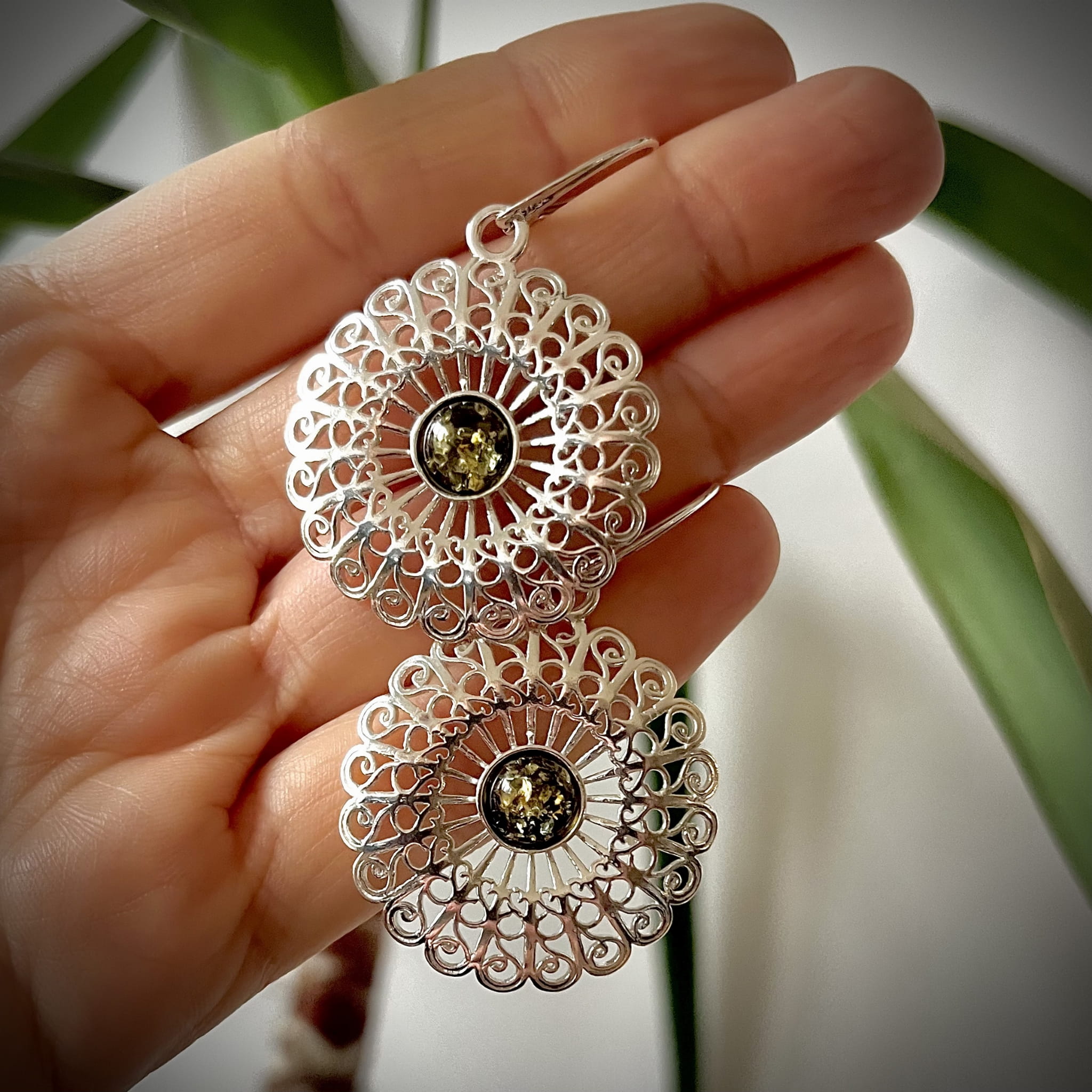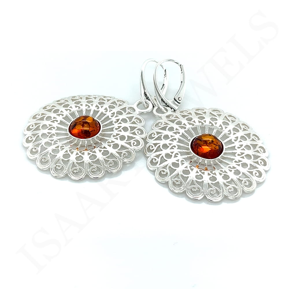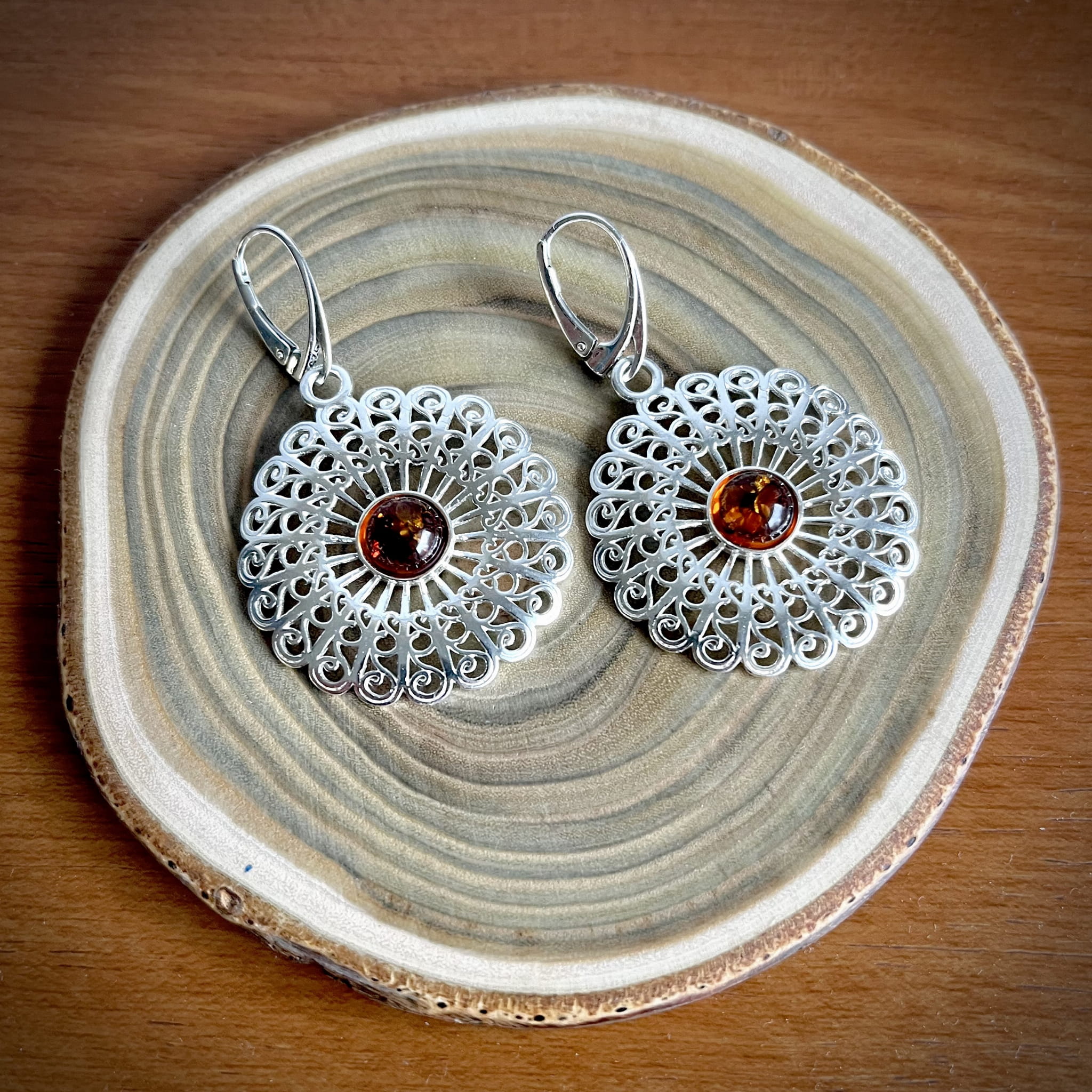 Duże Kolczyki Srebrne Rozety z Bursztynem