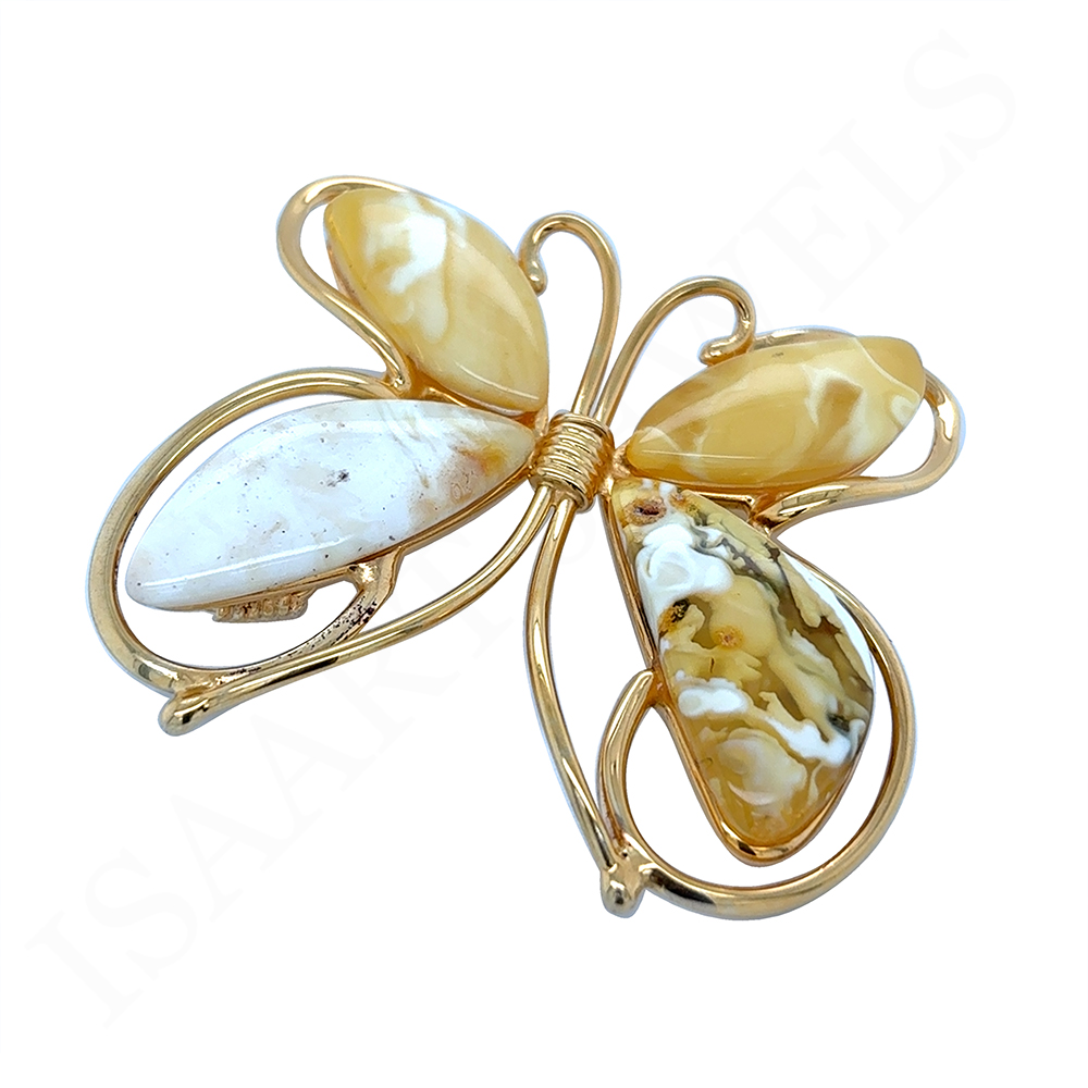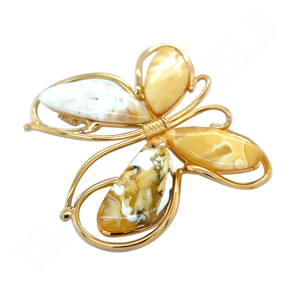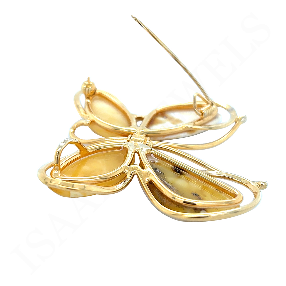 Wykonałam go z pozłacanego srebra próby 925 i unikatowych kawałkow Bursztynu Bałtyckiego w wyjątkowym mleczno-żółtym odcieniu. Motyla możesz użyć w dwojaki sposób. Możesz go zawiesić na łańcuszku w formie wisiora. Jednak dołączyłam tutaj rownież szpilkę, dzięki czemu Motyla możesz użyć jako Broszki.