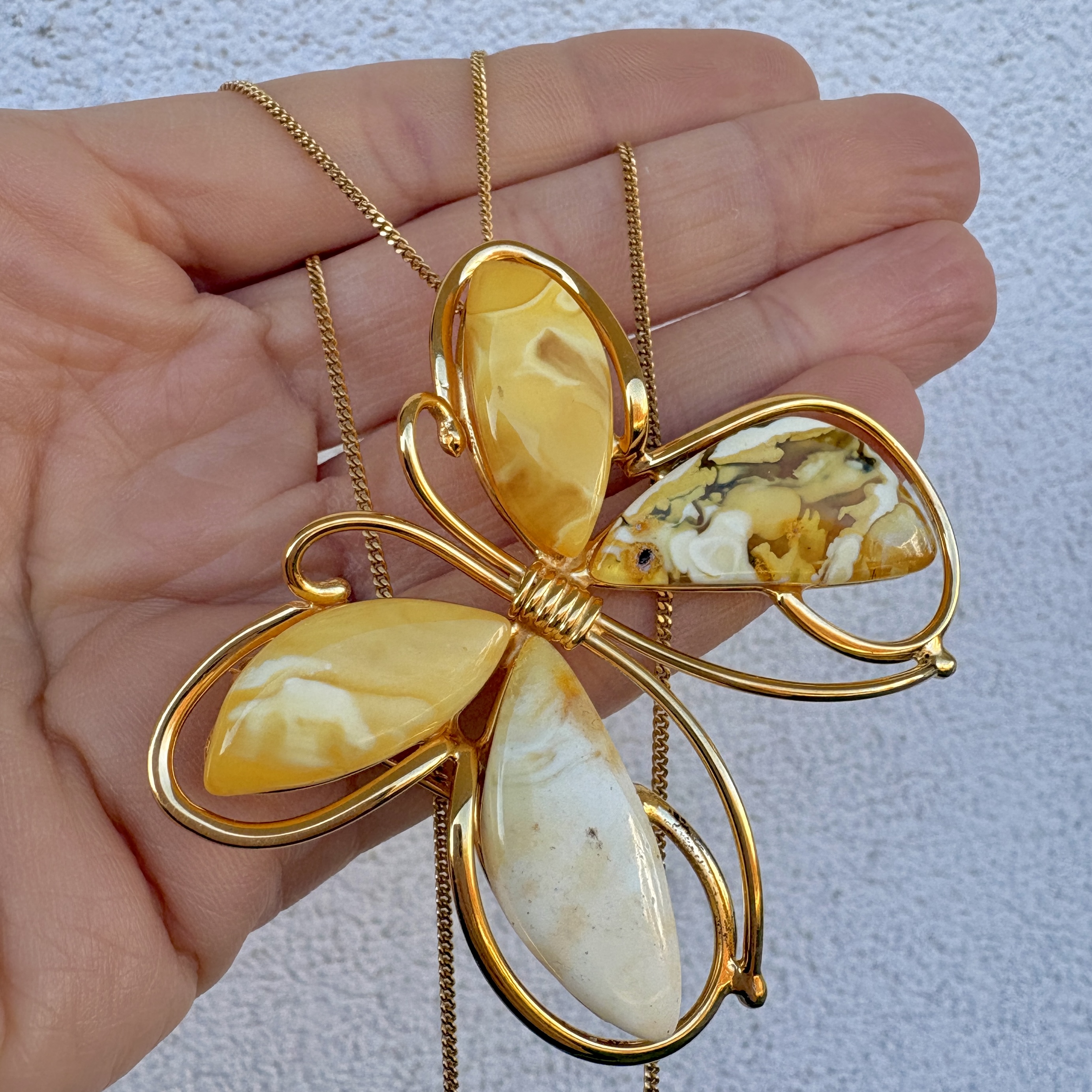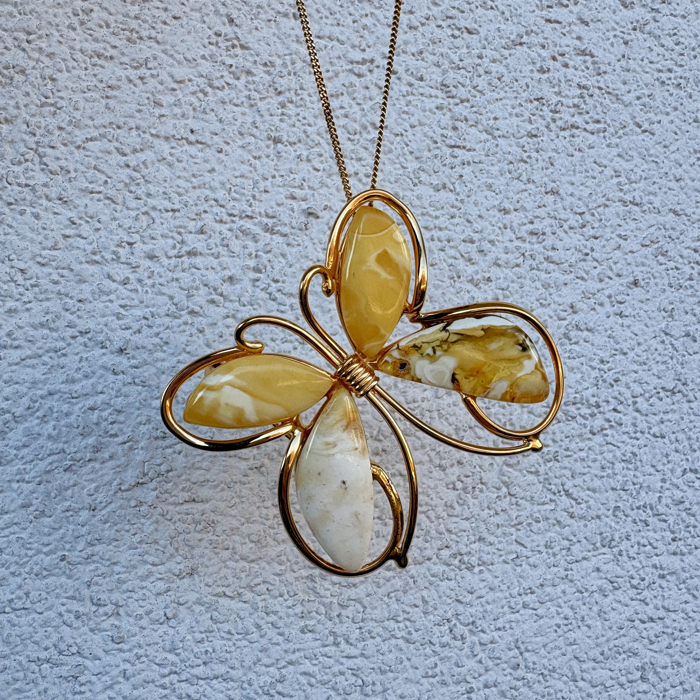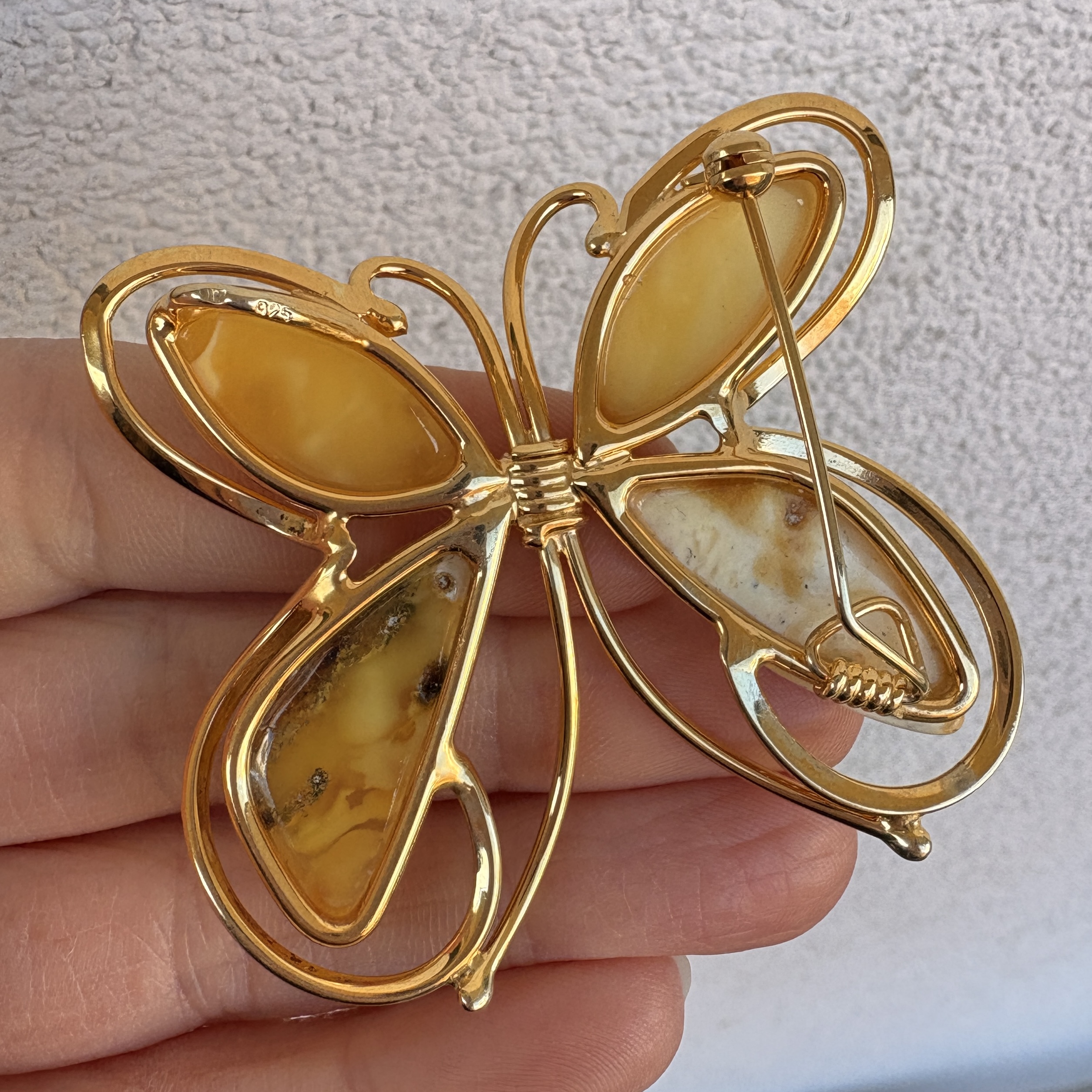 Wykonałam go z pozłacanego srebra próby 925 i unikatowych kawałkow Bursztynu Bałtyckiego w wyjątkowym mleczno-żółtym odcieniu. Motyla możesz użyć w dwojaki sposób. Możesz go zawiesić na łańcuszku w formie wisiora. Jednak dołączyłam tutaj rownież szpilkę, dzięki czemu Motyla możesz użyć jako Broszki.