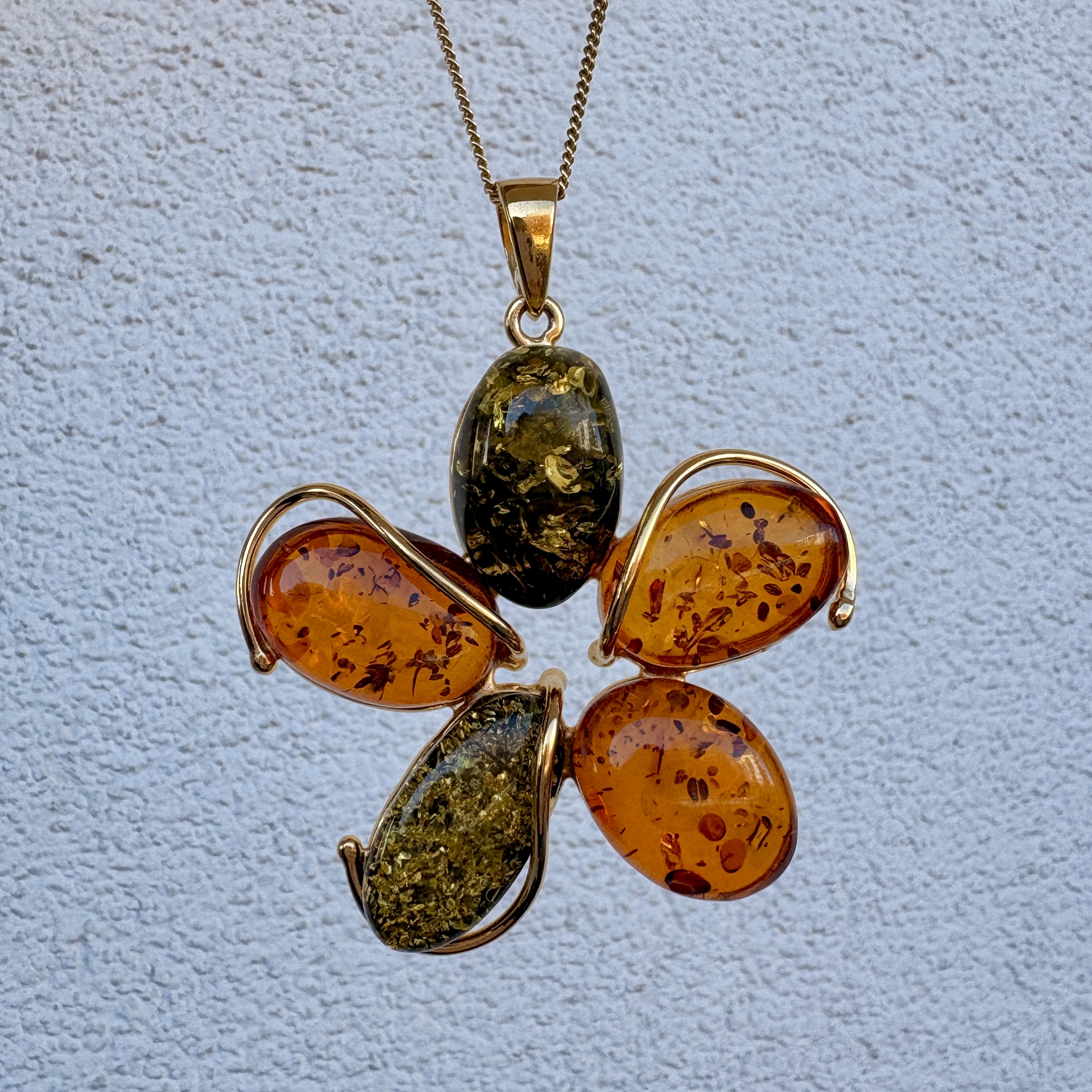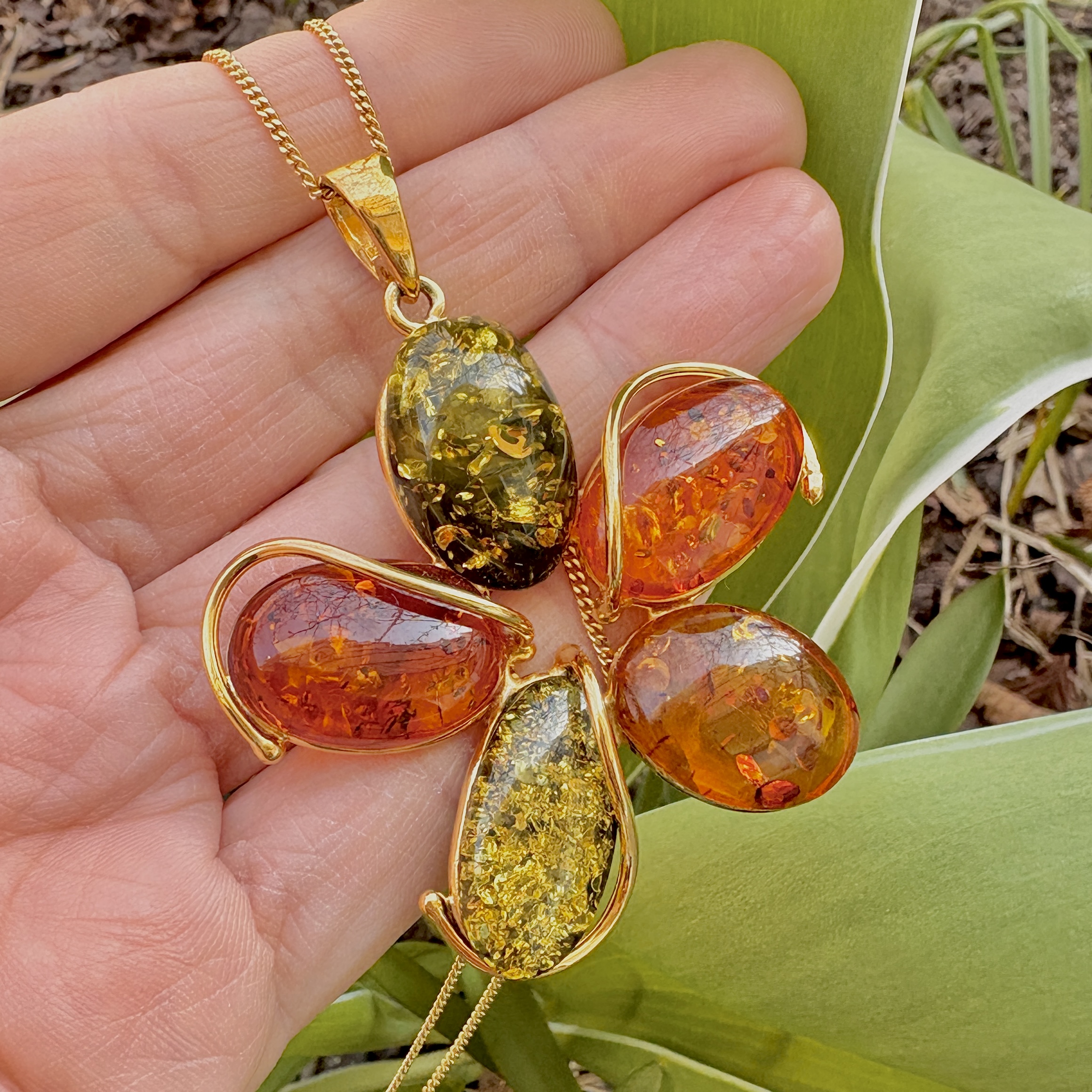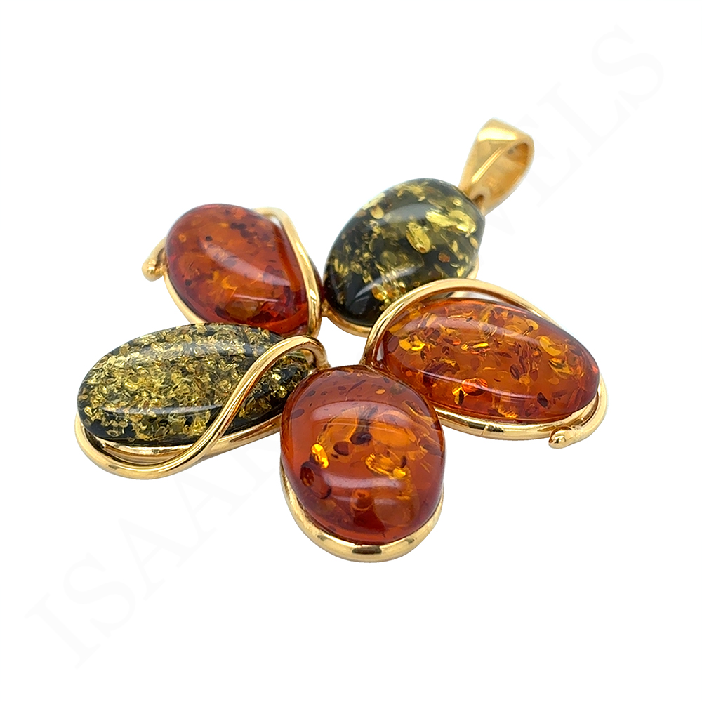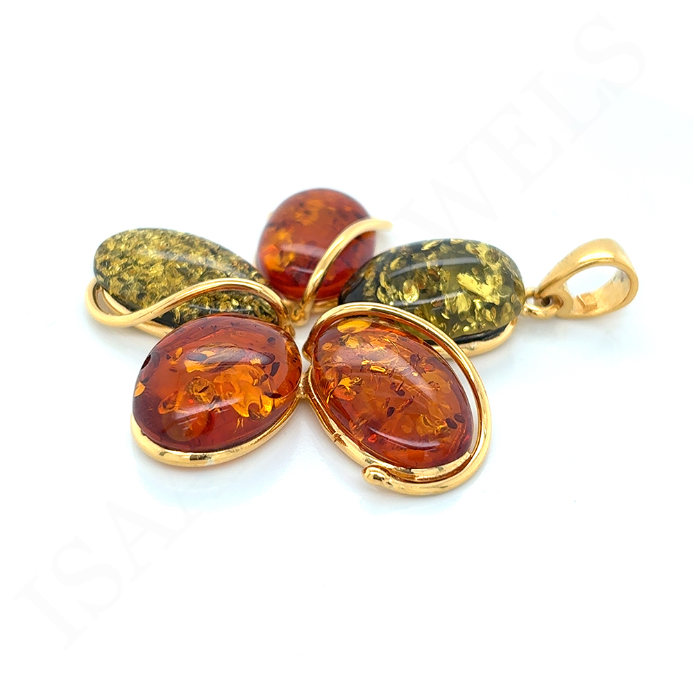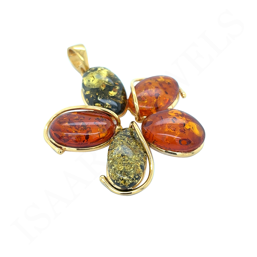 Wyjątkowy wisiorek wykonany ręcznie z pozłacanego srebra próby 925 i prawdziwych Bursztynów Bałtyckich w odcieniach koniaku i zieleni.